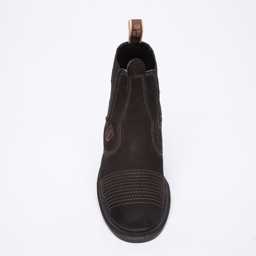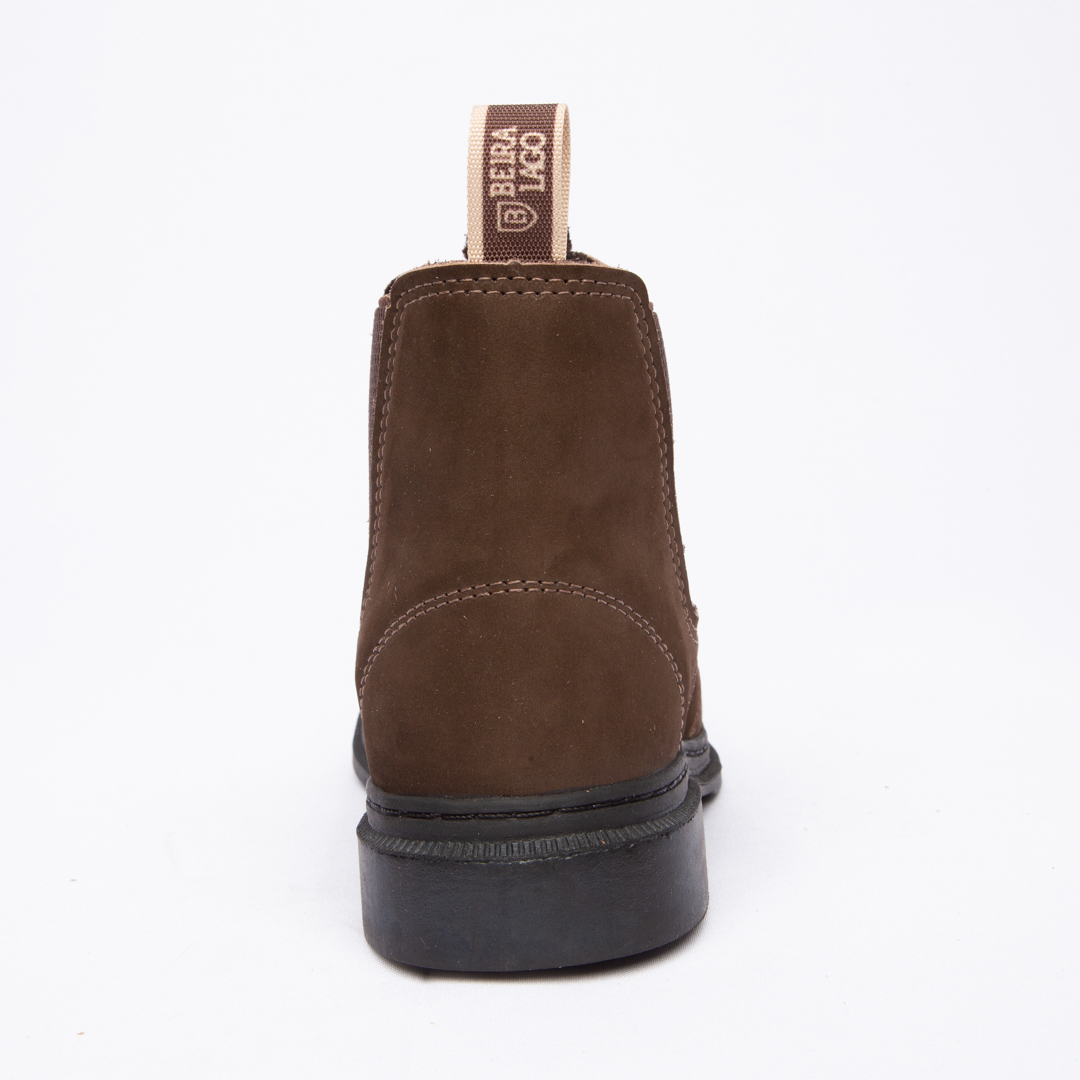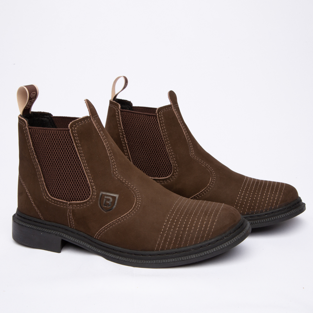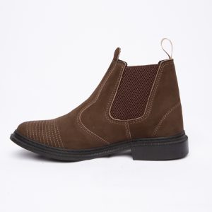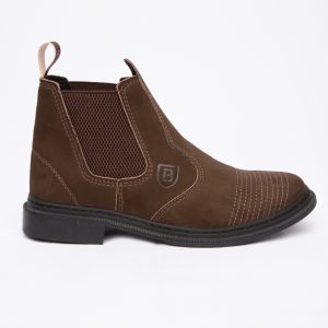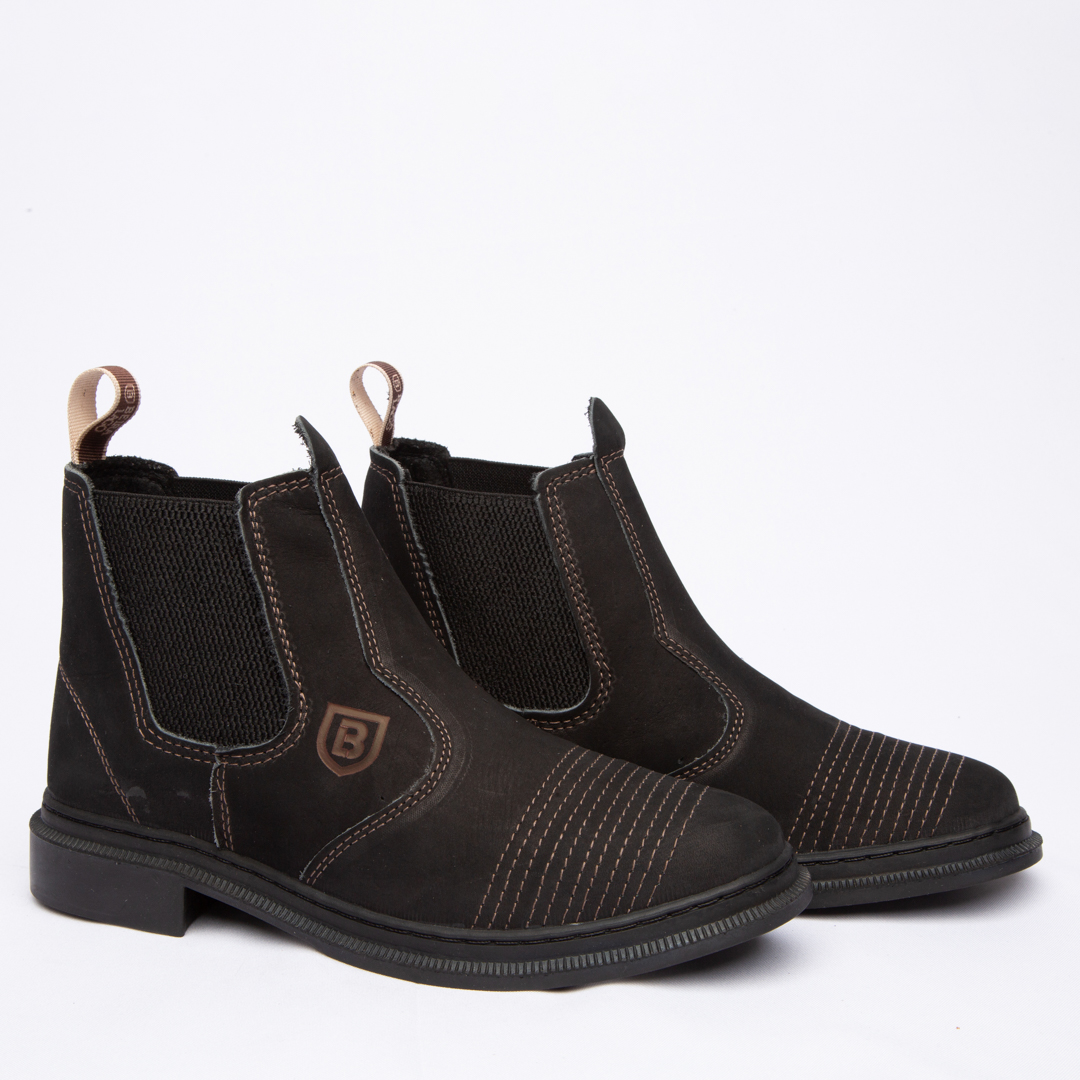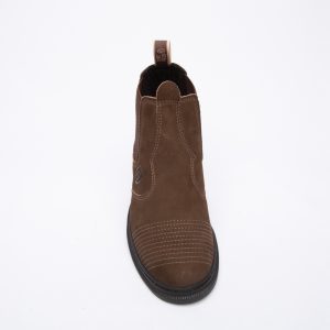 Botina masculina bordada, couro nobuck, solado de borracha, com puxador para calçar.