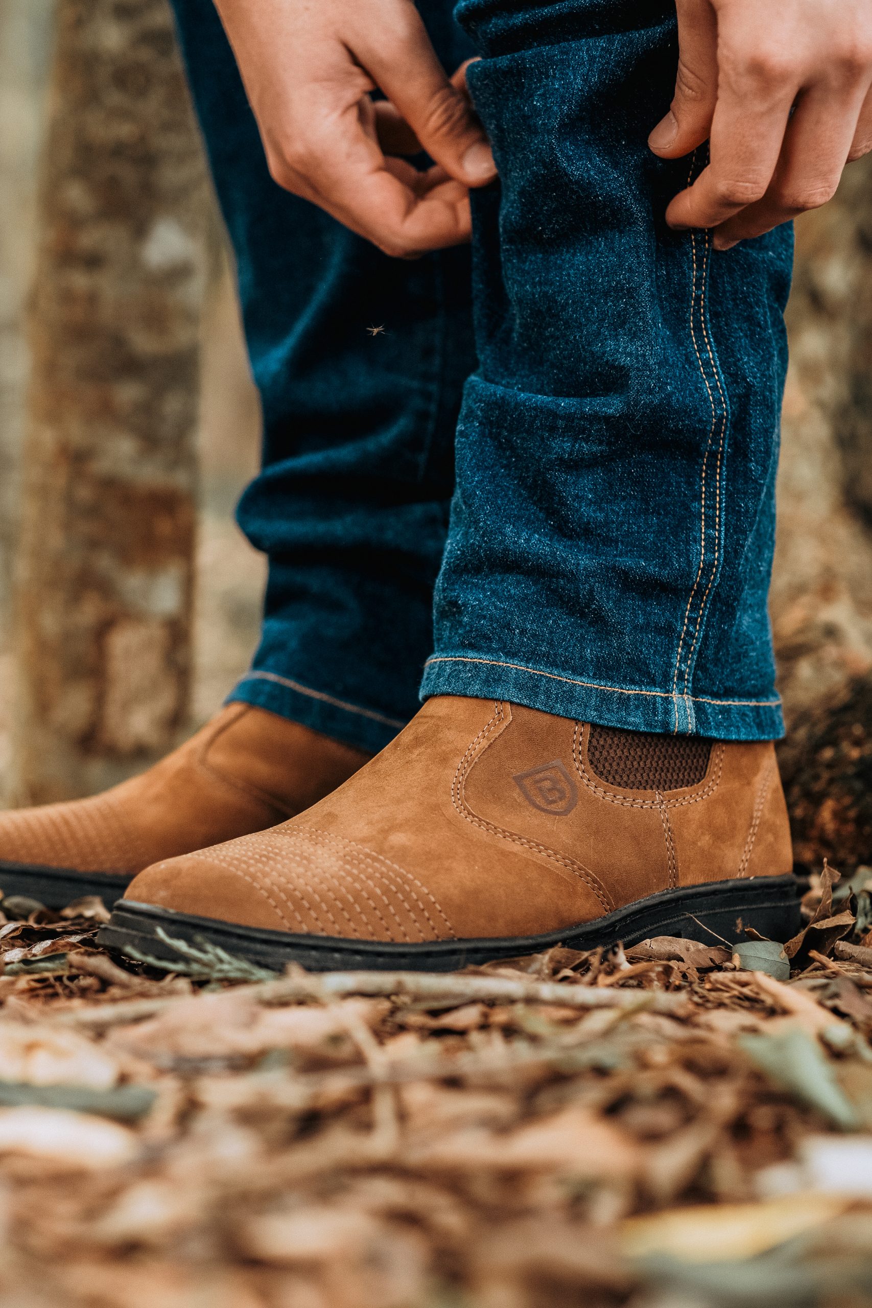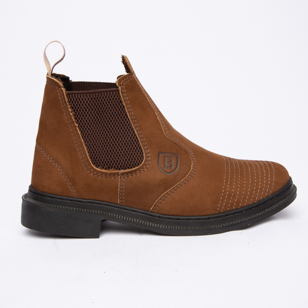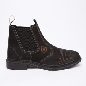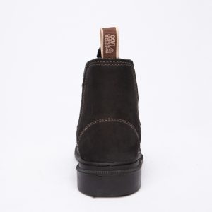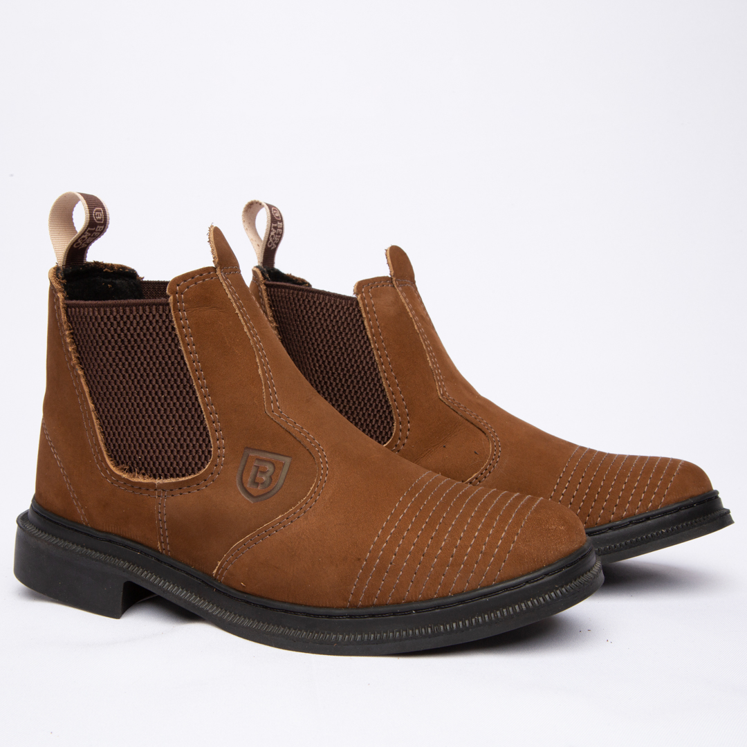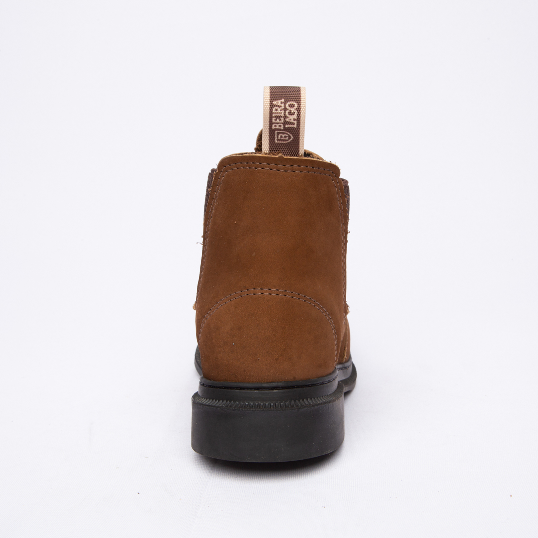 Botina masculina bordada, couro nobuck, solado de borracha, com puxador para calçar.