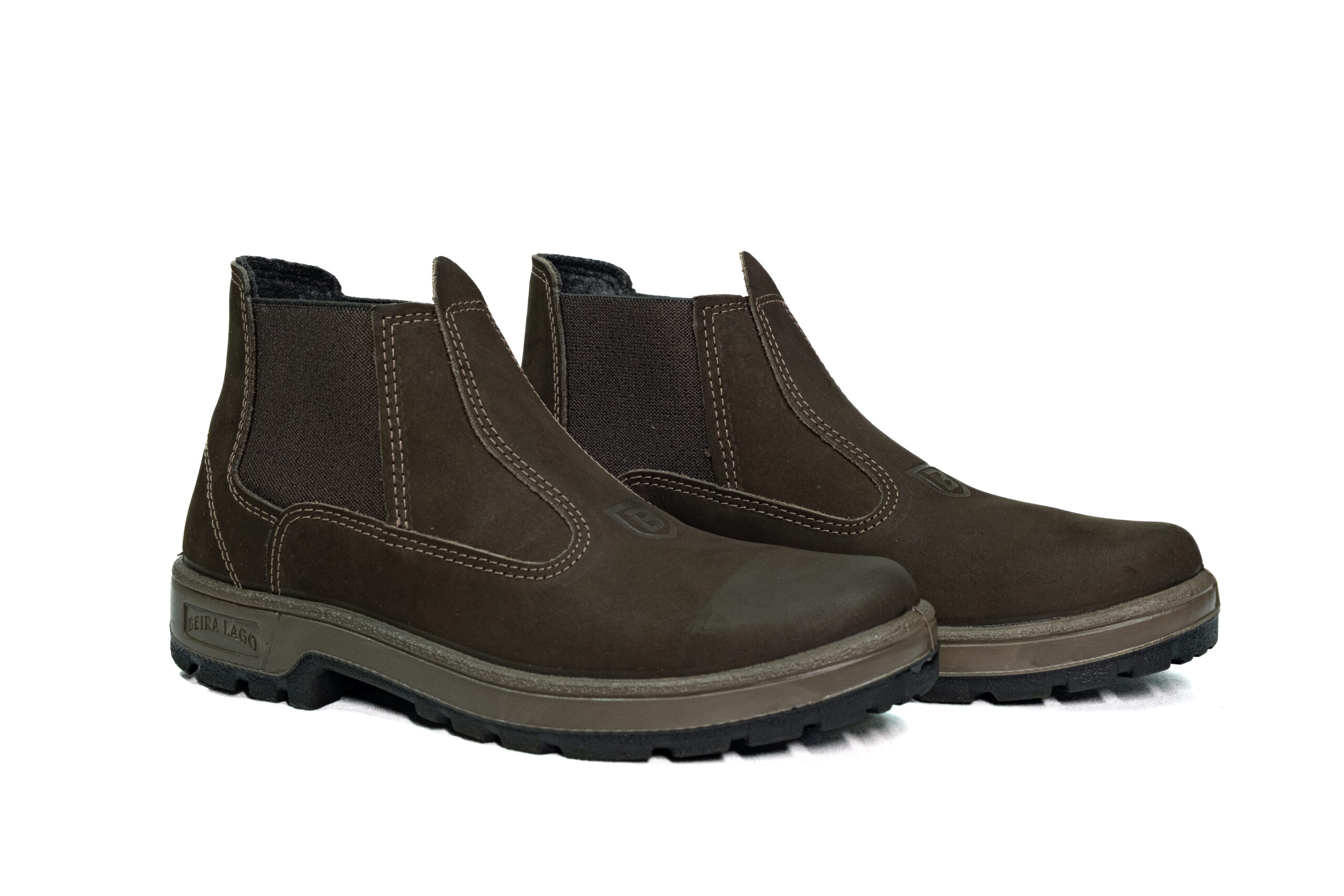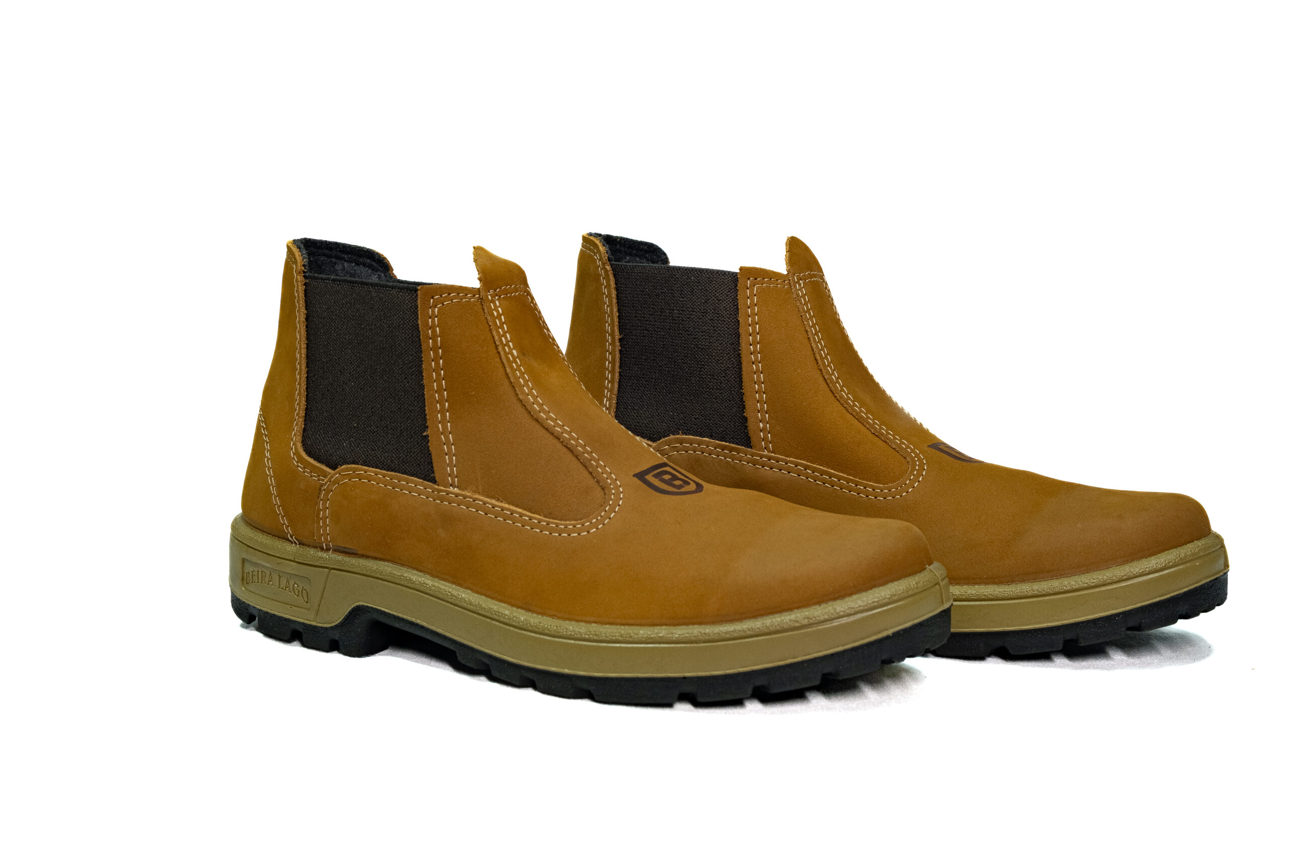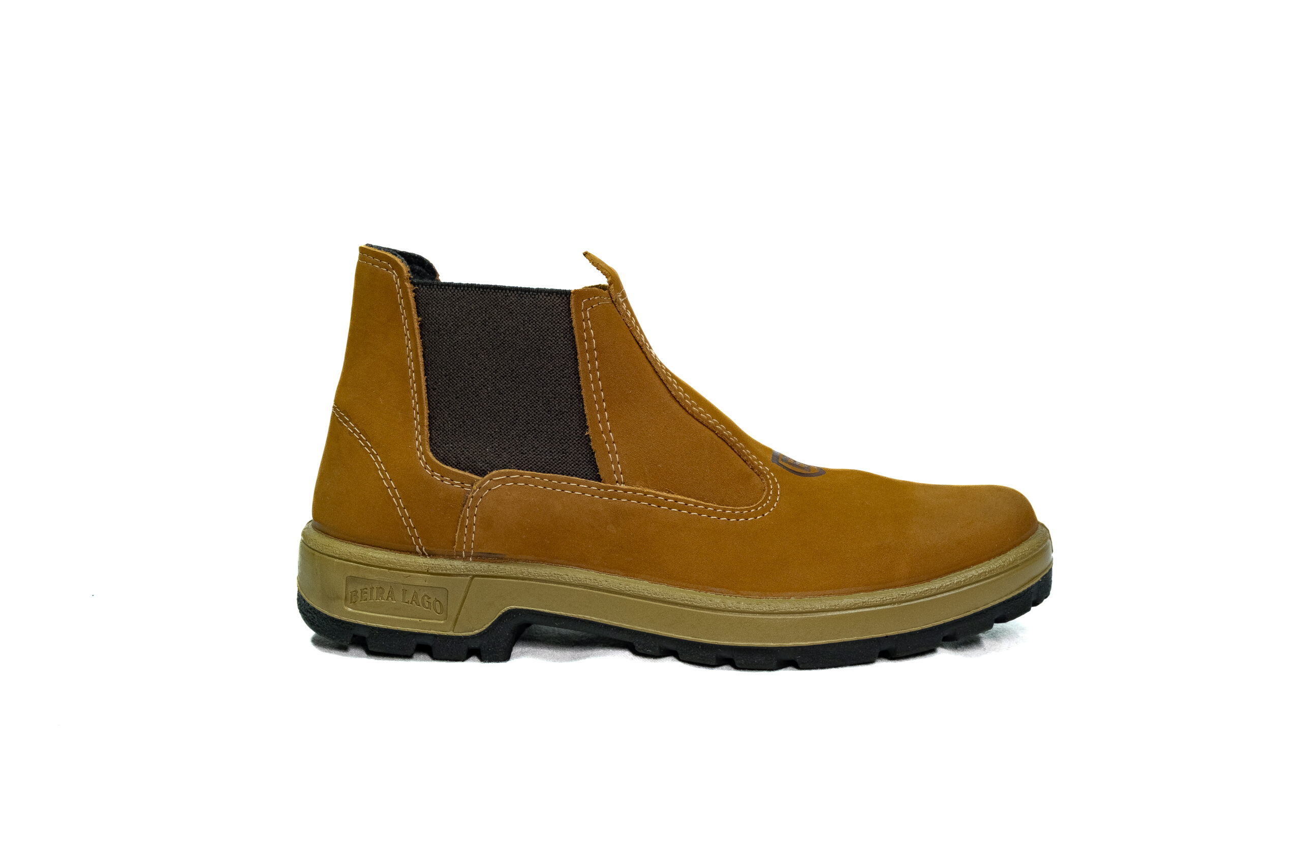 Botina de trabalho, com elástico, injetada em bi densidade em PU Poliéter, couro nobuck.