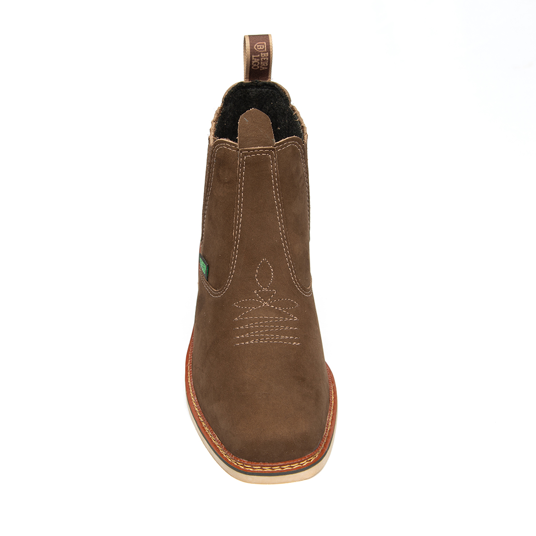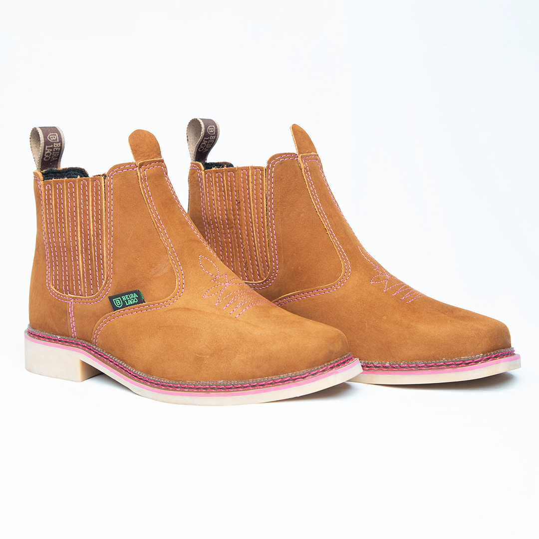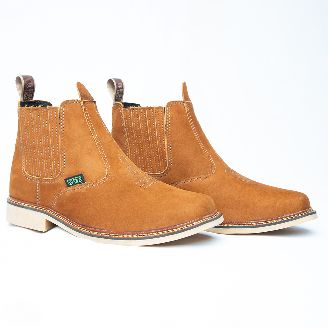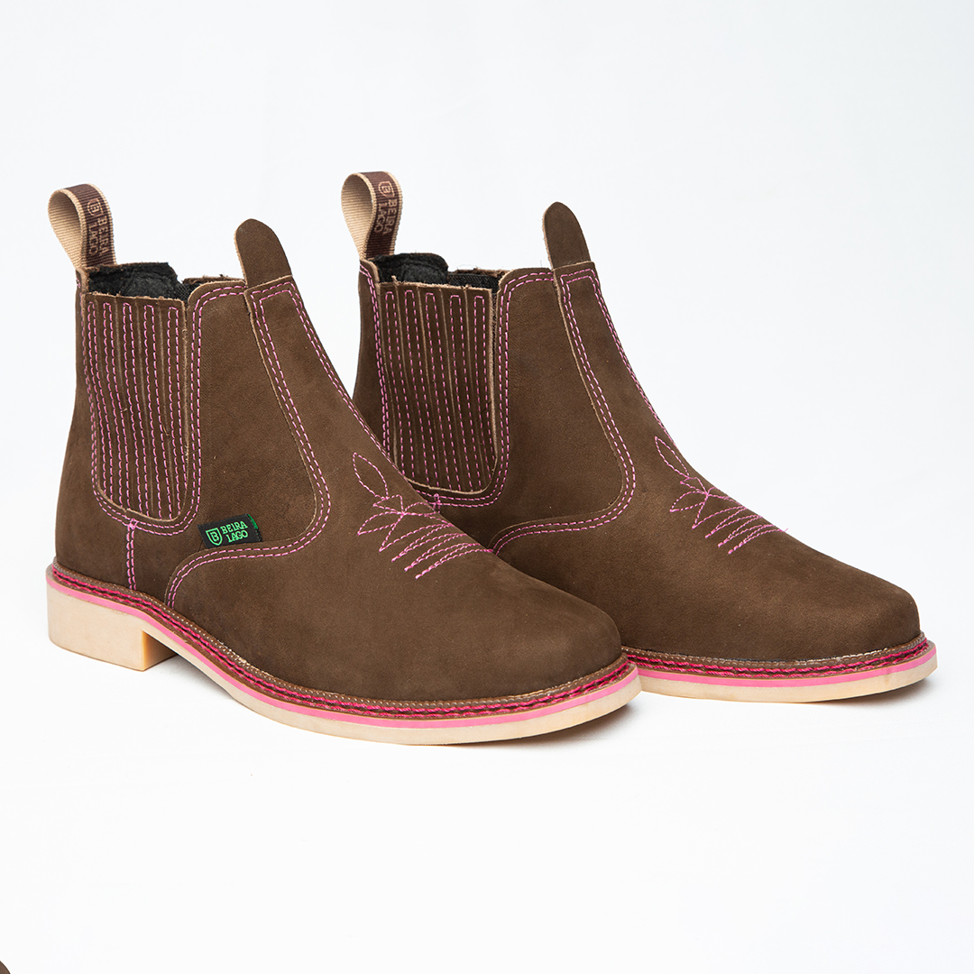 Botina bordada, com sanfona, couro nobuck e solado de látex.