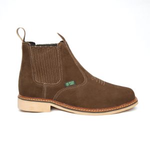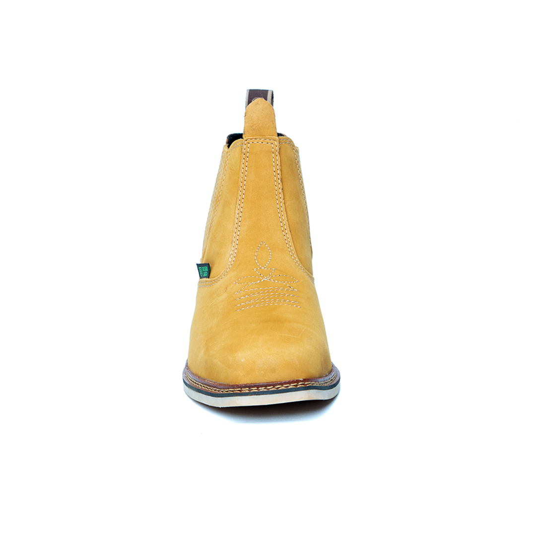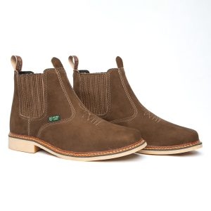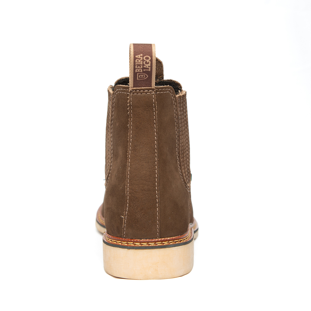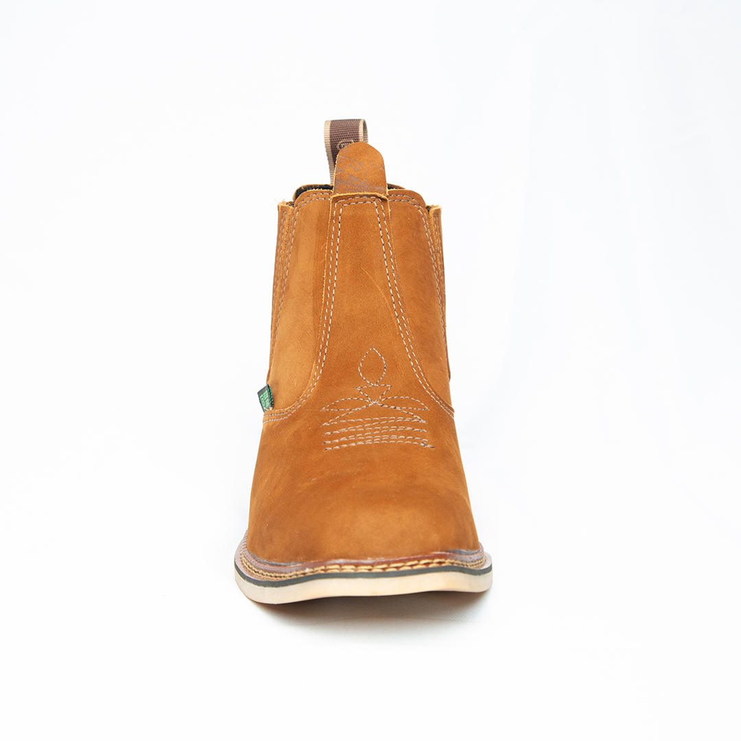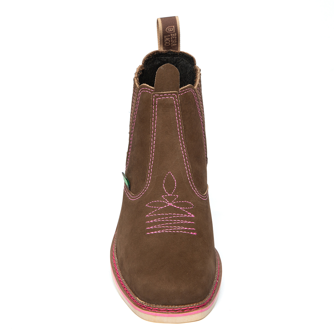 Botina bordada, com sanfona, couro nobuck e solado de látex.