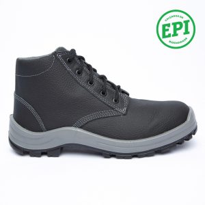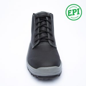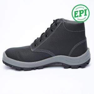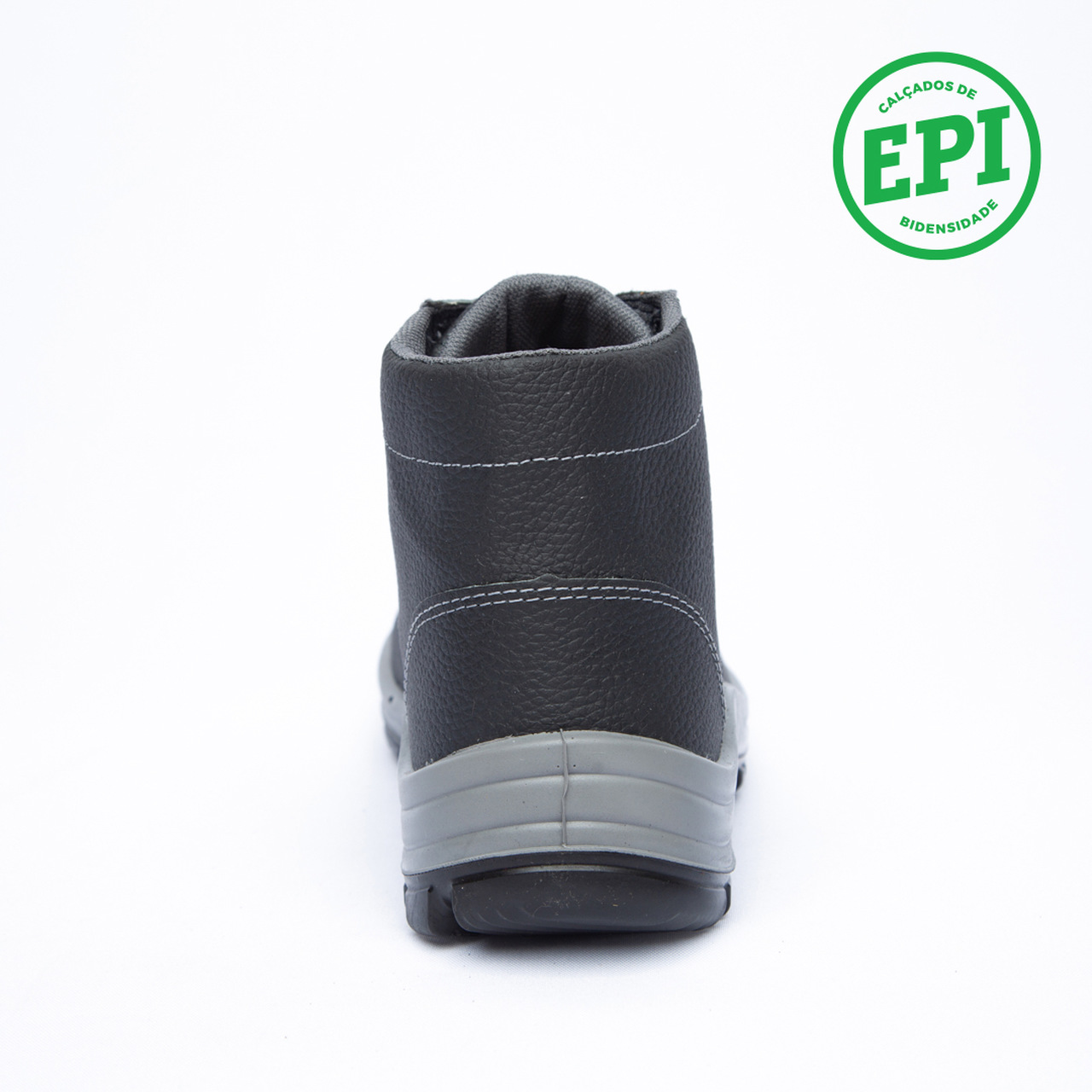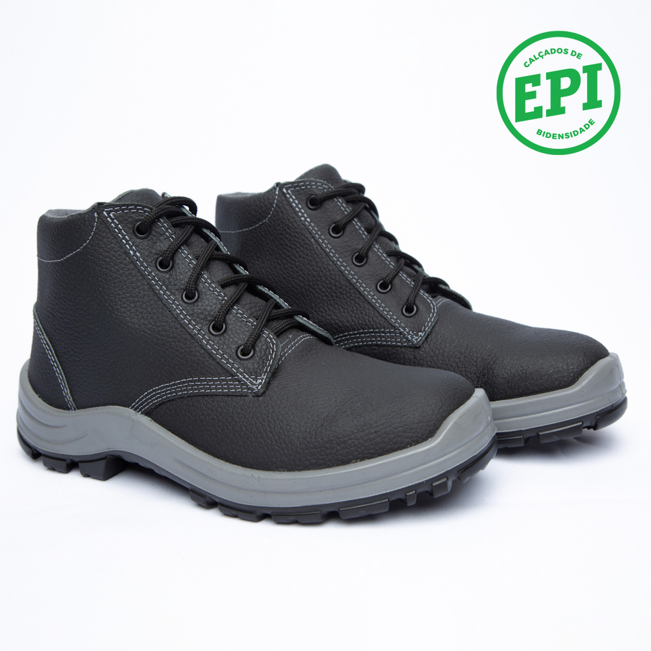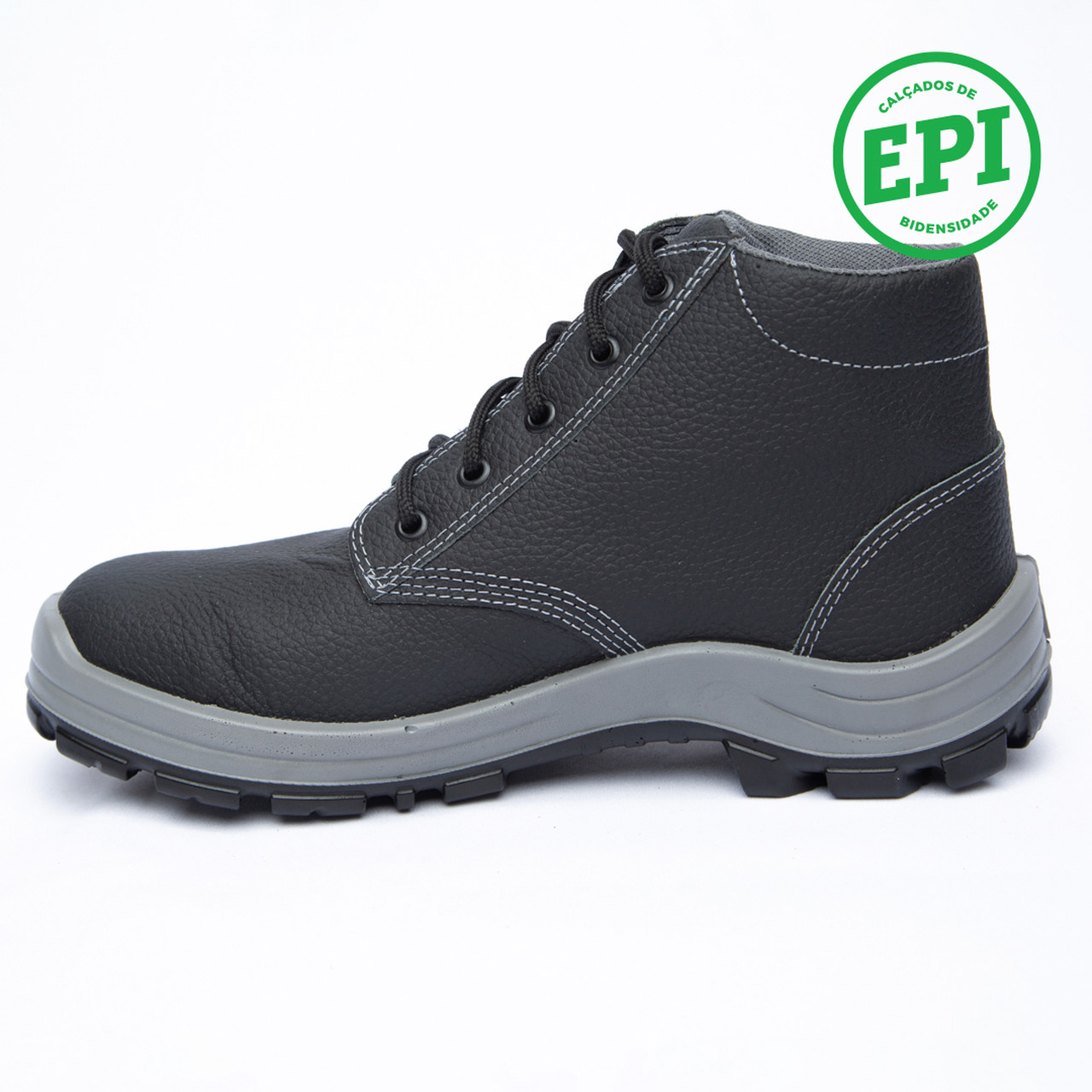 Botina de segurança, em couro raspa, com cadarço, bico de composite, solado em bi densidade PU Poliéter.